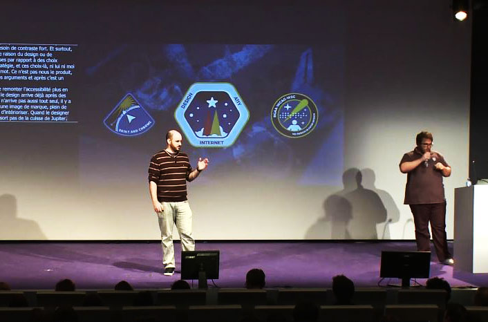 Lors de la conférence Paris Web de 2017 sur l’accessibilité et le design avec Aurélien Levy, nous avions utilisé la métaphore de la conquête spatiale et de l’entente USA / URSS pour illustrer notre propos. Pour la conclusion de nos slides, j'avais dessiné 3 écussons pour représenter le design et l’accessibilité comme des missions spatiales.